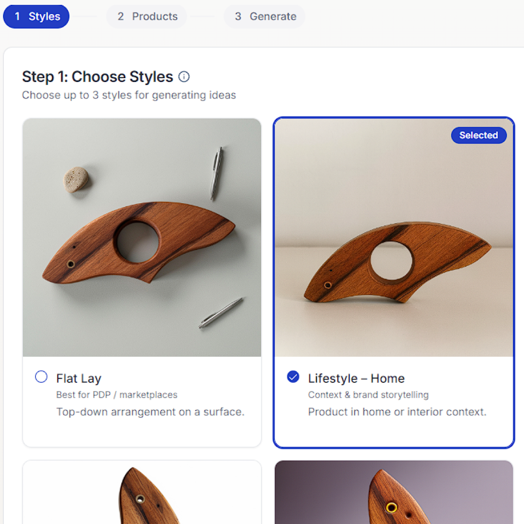 Genera fotos de empaque, lifestyle, y variaciones en cualquiera de nuestros estilos predefinidos.